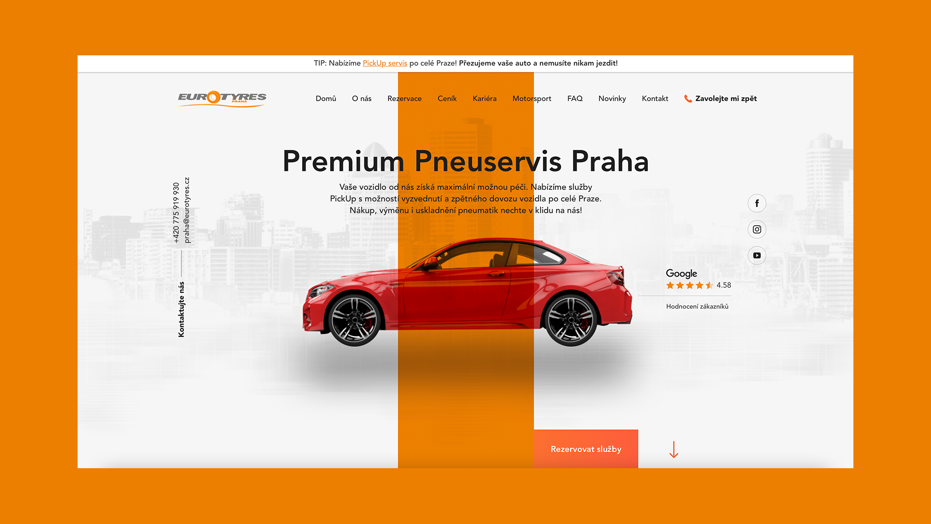 Kompletní realizace designu webové prezentace EuroTyres byla provedena s důrazem na intuitivní uživatelskou zkušenost (UX) a vizuální atraktivitu (UI). Práce zahrnovala vývoj responsivního front-endu a robustního back-endu, což zajišťuje plynulou funkčnost a uživatelskou přívětivost. Integrace rezervačního systému s CRM a ERP byla efektivně realizována prostřednictvím API, což umožňuje bezproblémové propojení s podnikovými procesy.