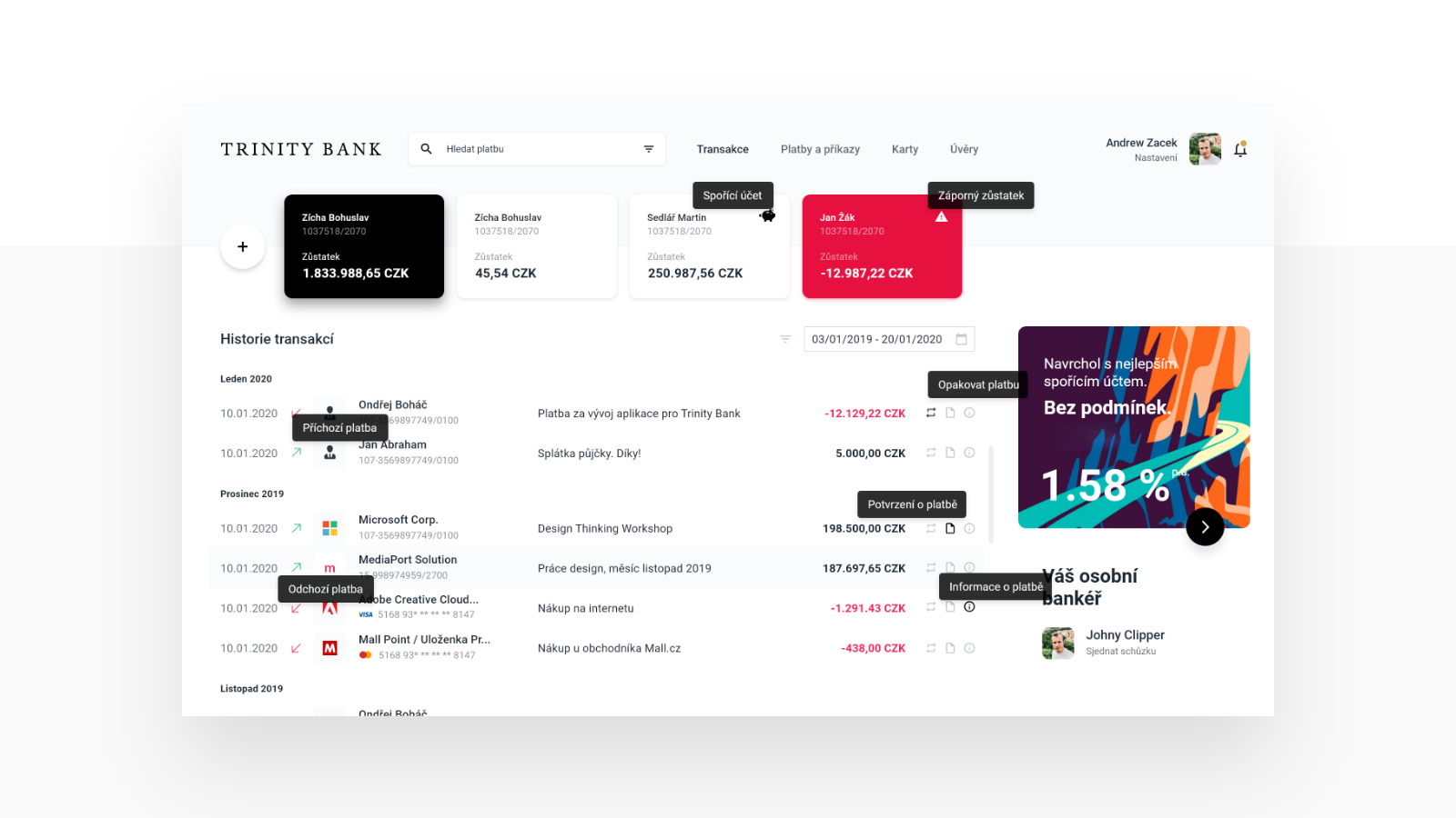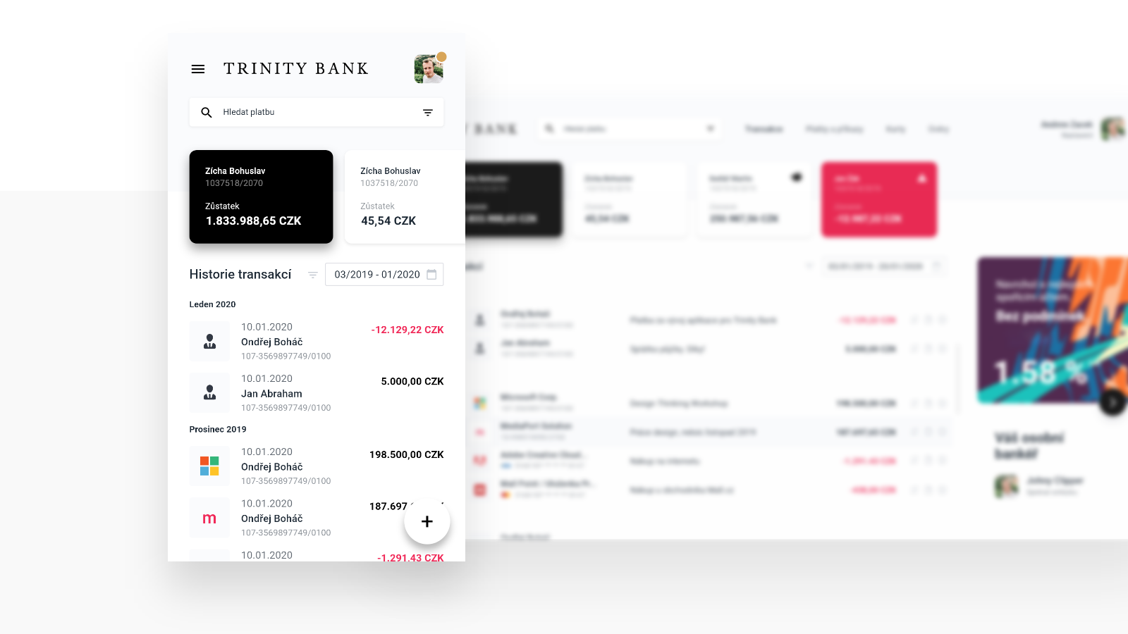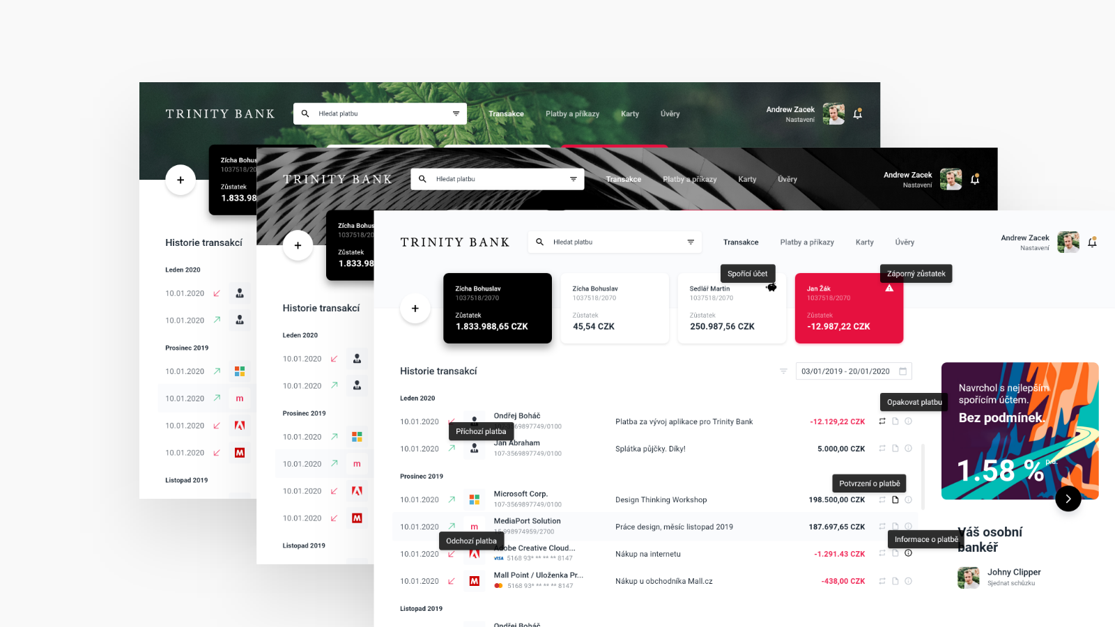 Kreativní koncept a UX studie online bankovnictví nové české banky Trinity Bank.